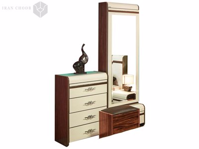 دراور و قاب آینه سرویس خواب طاووس از نظر طراحی های به کار رفته بر روی بدنه ی خود و همچنین ترکیب رنگی کاملا مشابه تخت خواب آن است.این دراور ...