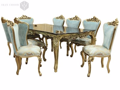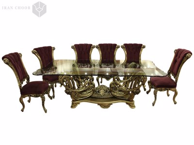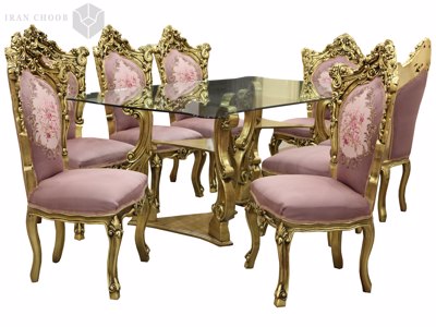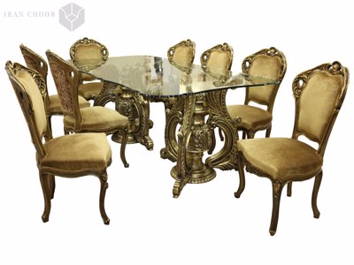 صندلی نهار خوری استیل آبنوس دارای بدنه ای از جنس چوب راش است که با توجه به پوشش ورق طلا به کار رفته بر روی آن و همچنین طرح های نقش بسته بر ...