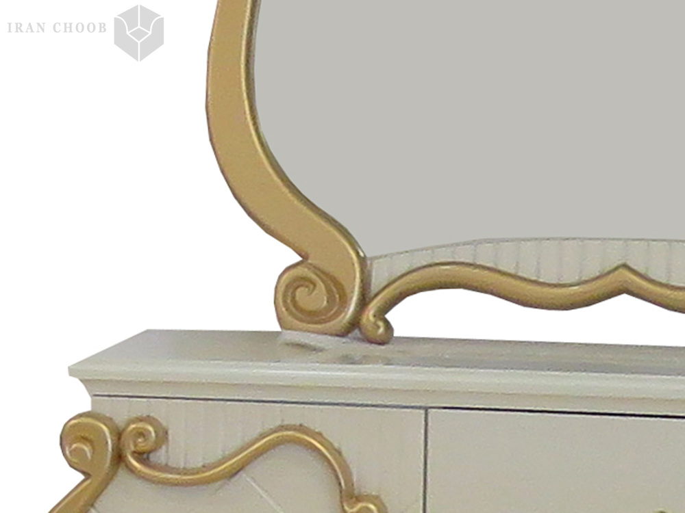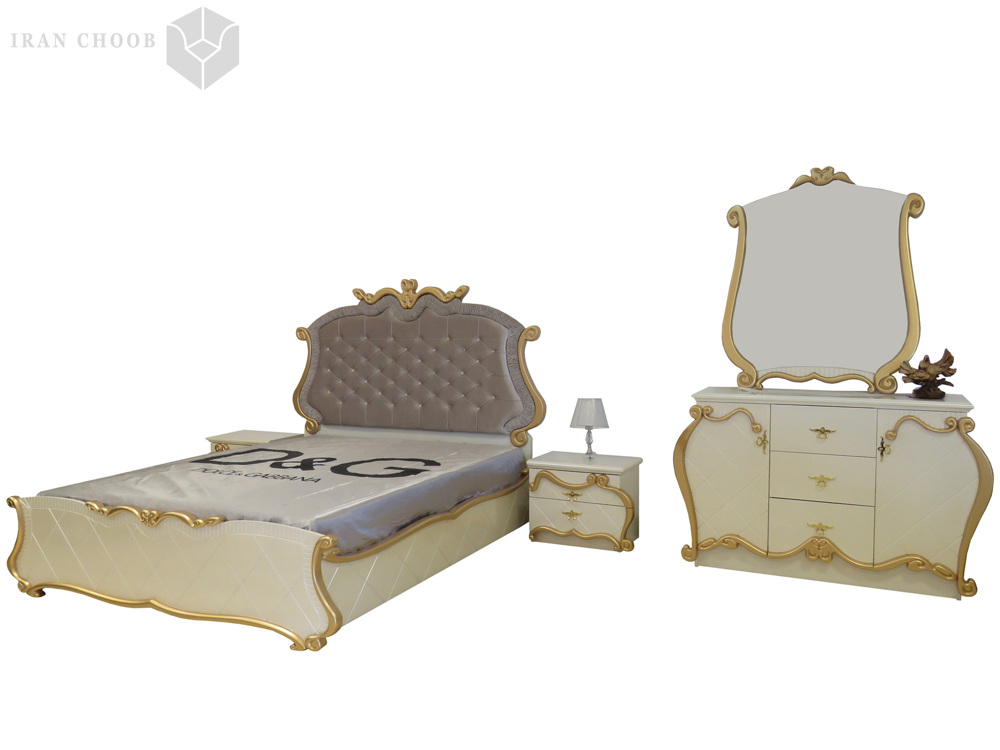 شامل 5 قطعه : 1 عدد تخت خواب + 1 عدد دراور و قاب آينه + 2 عدد پاتختي + 1 عدد صندلي سرويس خواب