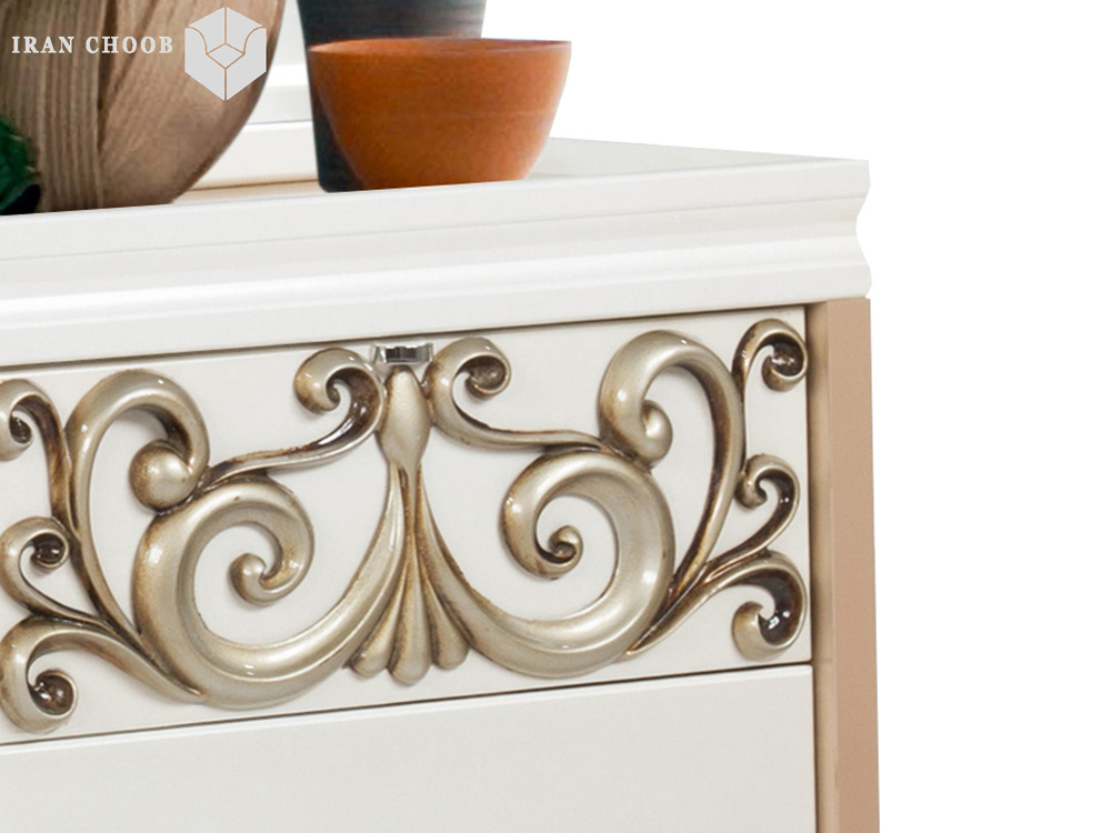 دراور و قاب آینه سرویس خواب وندا دارای بدنه ای از جنس ام دی اف می باشد.ابعاد بسیار مناسب قاب آینه سرویس خواب وندا و همچنین طرح های به کار رفته در محیط پیرامون آن می تواند این محصول را از جمله بهترین انتخاب های ممکن برای اتاق خواب شما گرداند.قسمت دراور سرویس خواب وندا دارای دو کشو عریض جهت قرار گیری البسه و همچنین دو کشو به نسبت کوچکتر برای قرار گیری وسایل شخصی شما نیز می باشد.طرح های منبت به کار رفته بر روی دو کشو مذکور از دیگر نکات بسیار زیبا این دراور سرویس خواب می باشد.